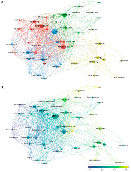 Increasing evidence has also revealed that miRNA-mediated gene regulation plays a significant role in heavy metal regulatory networks. In addition, high-throughput genome-wide expression profiling has greatly improved our current understanding of the key involvement of miRNA in the toxic response of plant HMs and its targets. A substantial number of heavy-metal-responsive miRNAs have been identified in the Oryza sativa L., Zea mays L., Medicago truncatula L., Hordeum vulgare L., Vitis vinifera L., Brassica juncea L., and many other plants (Table 1) [6,29,30]. In different plant species, many miRNAs have significant differential expression of different HM such as Cd, Hg, Al, As, and Cr. Through the analysis of metal-regulated miRNA target genes, it has also been identified that many miRNAs are involved in the response of plants to HM. The target genes for various processes, including metal absorption and transport, sulfate distribution and assimilation, protein folding, antioxidant systems, and plant hormone signal transduction processes [11]. We searched the Web of Science core collection database for articles related to miRNA and heavy metals such as Cu, Cd, Hg, Al, As, and Cr in the past 10 years, and a total of 568 papers were retrieved. The research fields are mainly distributed in three aspects: Life Sciences Biomedicine, Science Technology, and Physical Sciences. Then, bibliometric analysis was performed using VOS software [31], and four clusters were formed with miRNAs, stress, cadmium, and strategy as the research centers (Figure 1). These keywords are categorized by publication year to deepen the analysis. The VOSviewer software represents the year with the highest number of publications between 2016 and 2019. However, articles from 2011 to 2022 were included in this analysis. The blue circles represent topics that have been intensively studied in the past decade, such as stress response, miRNA, target gene, etc. The results of the two co-occurrence maps showed that miRNAs and stress were most closely related, suggesting that the involvement of miRNAs in stress response is the current research hotspot.