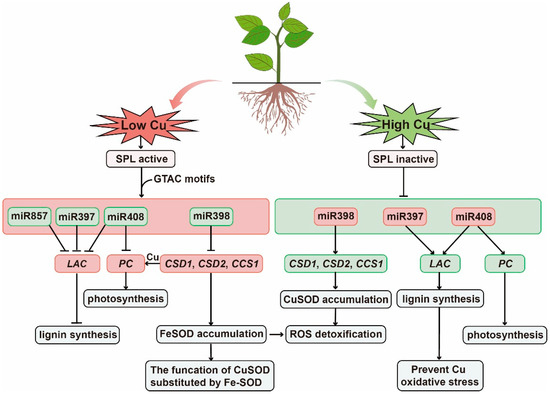 The study found that the promoter regions of these several miRNAs all have Cu-response elements (CuRE) as the role sites of Cu regulation, which is composed of repeated GTAC sequences and is the only Cu-responsive element identified to date [83]. SQUAMOSA promoter-binding protein-like-7 (SPL7) is a key transcription factor that is sensitive to low Cu and plays a transcriptional regulatory role by binding to GTAC sequences [45]. In Cu deficiency, SPL7 can activate the transcription of miR397, miR398, miR408, and miR857 genes, which inhibit the expression of copper-containing protein genes such as laccase and Cu-Zn superoxide dismutase, thereby regulating Cu in the case of Cu-deficiency allocation [45]. When Cu accumulates, SPL7 becomes inactive and the expression of miRNAs in plants are inhibited, which increases the transcription level of target genes and improves the availability of Cu proteins, thus alleviating the oxidative damage caused by copper accumulation (Figure 2).