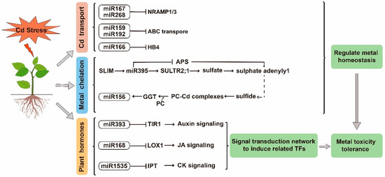 Cd stress leads to the excessive accumulation of ROS in plants, which damage lipids and protein nucleic acids and influence the growth and development of plants, while miRNAs play a key role as post-transcriptional regulators of genes involved in antioxidant response pathways [94]. miRNA eliminates ROS by targeting and regulating the expression of related genes, such as superoxide dismutase (SOD), catalase (CAT), ascorbate peroxidase (APX), and non-enzymatic components, such as ascorbic acid (AsA) and GSH [56,95]. After treating wheat seedlings with 150 mM Cd solution, the expression of miR398 in wheat leaves decreased, while the expression of its target gene CSD increased. The decrease in miR398 levels leads to the accumulation of CSD mRNA, which plays an important role in catalyzing the mutation of superoxide radicals into H2O2 [96]. A study discovered that overexpressing miR156 (miR156OE) accumulated significantly less Cd in the Arabidopsis shoot, increased the activities of antioxidative enzymes, and reduced the level of endogenous ROS, which further improved the tolerance to Cd stress [11]. Furthermore, high-affinity ligands are used to chelate Cd and reduce its biological toxicity. Sulfur (S) is an essential macronutrient for plants, and sulfate (SO42−) is the main form of inorganic sulfur nutrient in the soil, which plays a role in plant responses to Cd exposure [11]. Sulfate is assimilated in plant cells with the help of a number of key enzymes to produce the sulfur-containing metabolites cysteine and GSH, as well as PCs and other sulfur-containing compounds, which play a key role in plant chelation and antioxidant defense against Cd toxicity [97,98]. Research indicates that miRNAs alleviate the Cd stress causing oxidative damage by targeting the related genes that regulate this process. Its absorption and assimilation are particularly important for the metal tolerance of plants. Studies have shown that sulfate transporter 2; 1 (SULTR2; 1) and ATP sulfonylase 1, 3, 4 (APS 1, 3, 4) are sulfate-assimilation-related genes that can be targeted and regulated by miR395, which proves that miR395 is involved in the process of sulfur assimilation [72,92,99,100]. In B. napus, overexpressing miRNA395 can strengthen Cd tolerance by regulating the increase in the pure content of GSH and non-protein sulfur [92]. Consistent with this, when the high-Cd-accumulation variety B. parachinensis was treated with Cd stress, the enhancement of miR395 promoted the accumulation of Cd, but these plants showed less metal toxicity [101]. Zhou et al. demonstrated that this is probably due to the sulfur assimilation regulated by miR395 involved in the Cd accumulation and detoxification of high-Cd-accumulating varieties [92]. Moreover, the induction of miR395 expression is controlled by sulfur-restricted 1 (SLIM1); SLM1 is a transcription factor for assimilating sulfur metabolism in higher plants and regulates the major pathway of sulfate uptake and metabolism under the -S environment in Arabidopsis roots. The miR395 acts downstream of the SLIM1 transcription factor and upstream of APS and SULTR2;1, to control the distribution and assimilation of sulfate, thereby improving plant tolerance to Cd stress [1,102].