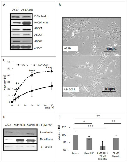 Cisplatin [cis-diammineplatinum(II) dichloride], was obtained from Sigma-Aldrich (St. Louis, MO, USA) and dissolved in DMSO. Disulfiram was obtained from Cayman Chemical and dissolved in DMSO. Aliquots were stored at −20 °C for up to a maximum of three months and thawed immediately before use. WST-1 [2-(4-Iodophenyl)-3-(4-nitrophenyl)-5-(2,4-disulfophenyl)-2H-tetrazolium] was purchased from ScienCell (Research Lab., Carlsbad, CA, USA) freshly made, #8038; RIPA lysis buffer was purchased from VWR Chemicals, #N653-100 mL; protease inhibitor was purchased from Thermo Fisher Scientific (Waltham, MA, USA), #PIER87785; BCA purchased from Thermo Fisher Scientific, #PIER23225. Primary antibodies: E cadherin #3195P cell signaling, N cadherin #13116P cell signaling, ABCC1 #VMA00330 BioRad (Hercules, CA, USA), ABCC4 #PA5-18315 Thermo Fisher Scientific, ABCG2 #BRB155559 Biorbyt (Cambridge, UK), GAPDH #sc-32233 Santa Cruz Biotechnology (Dallas, TX, USA), α-Tubulin #NB100-690H Novus Biologicals (Littleton, CO, USA), ALDH3A1 #PA5-80332 Thermo Fisher Scientific, ALDH7A1 #MA5-29028 Thermo Fisher Scientific. Secondary HRP-conjugated antibodies were purchased from Santa Cruz Biotechnology.