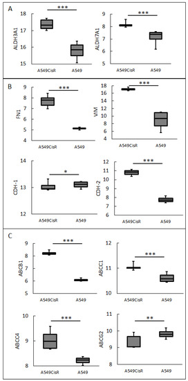 Cisplatin-resistance-related changes in mRNA expression of ALDH family proteins (A), EMT markers (B), and ABC proteins (C). NSCLC cell line A549 and its cisplatin-resistant variant A549CisR mRNA levels were analyzed using microarray dataset GSE108214, acquired from the public Gene Expression Omnibus (GEO) databases [59]. Normality test (Shapiro–Wilk) was performed, followed by the Mann–Whitney U test; * p < 0.05; ** p < 0.005; *** p < 0.001, not statistically significant—no indicator.