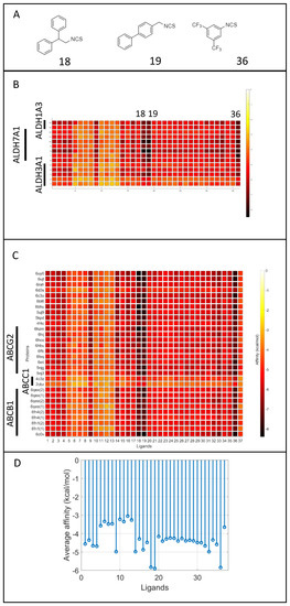 Molecular modeling of isothiocyanate (ICT) affinity to the tested ALDH and ABC proteins. (A) Chemical structures of three chosen ICTs: 18, 19, and 36. (B) ICT affinity to the models of ALDH isoforms and (C) ABC proteins obtained from RCSB Protein Data Bank. (D) Average affinity of ICTs to all selected proteins, calculated as average of all affinity value to all structural models of each protein.