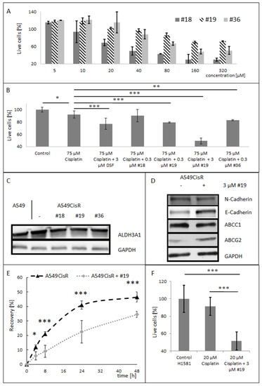 As compound 19 presented the strongest cisplatin-resistance reversion abilities and the highest tolerability in both tested cell lines, it was chosen for further study of its long-term impact on cisplatin-resistant NSCLC cells when applied at the same concentration as DSF itself (3 µM). Fifteen-day supplementation with 3 µM ITC 19 resulted in significant repression of ALDH3A1 expression (similarly to 18 and 36) (Figure 4C) suggesting the reversion of a stem-cell-like phenotype. Furthermore, compound 19 was found to partially reverse EMT phenotype, presenting increased expression of the epithelial marker E-cadherin, with no significant changes in N-cadherin expression (Figure 4D) (similar to DSF). Phenotype reversion was also accompanied by the acquisition of an ABC protein-expression pattern, characteristic of the non-resistant A549 parental variant (Figure 4D), i.e., a decrease in ABCC1 and an increase in ABCG2 expression.
