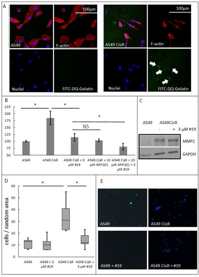 The obtained cisplatin-resistant variant of A549 presents a significantly higher migration rate as observed in the wound healing assay. However, migration has two main types: “path finding” (amoeboid migration type) and “path generating” (mesenchymal type of migration). Amoeboid migration is characterized by rounded cell morphology, low adhesion, high migration velocity, extensive cell body deformations caused by actin protrusions or hydrostatic membrane blebs, and its independence of extracellular matrix (ECM) degradation. Thus, amoeboid migration is based on cells’ abilities to find and fit into existing “paths”. On the other hand mesenchymal type of migration is acquired in non-mesenchymal cells via EMT and strongly depends on proteolytic degradation of ECM components (mainly via matrix metalloproteinases—MMPs), which enables crossing of the anatomical boundaries and in-aftermath metastasis [65,66]. Cisplatin resistance is often accompanied by increased metastatic potential. A549CisR presents higher proteolytic abilities than parental A549, as visualized by confocal microscopy imaging (zymography in situ assay—white arrows point increased gelatinolytic effect) (Figure 5A) and calculated using fluorescent dequenching (DQ) gelatin assay (Figure 5B). A549CisR supplemented with 3 µM 19 decreases gelatin degradation to the level observed for parental A549 and A549CisR treated with MMP2 inhibitor ARP101 (24 h, 10 µM). Interestingly, gelatin degradation presented by A549CisR supplemented with both 10 µM ARP101 and 3 µM 19 is slightly, yet statistically significant, lower than the one observed for either of the compounds alone, whereas the MMP2 protein level remains unchanged by 19 (Figure 5C). An increased ability to cleave ECM components such as collagen (or its degraded form—gelatin) is required by cancer cells during invasion and metastasis, as it provides physical disintegration of anatomical boundaries allowing for invasion of surrounding as well as distant metastasis [66]. Thus, invasive properties of A549 and A549CisR were tested (Figure 5D,E). Cells were treated with or without 3 µM 19 for 24 h, and next were transferred to gelatin coated 8 µm pore size upper chamber of Nunc Cell Culture Inserts in starving medium (with or without 3 µM 19). A full medium was used in lower chamber as chemoattractant. Cells were allowed to enter the membrane pores thru gelatin layer for 3 h. Next, the medium and the gelatin from the top surface of the membrane were removed, the invaded cells on the bottom surface of the membrane were washed 2× with PBS, and then fixed, stained with Hoechst 33342, and counted in five random spots. The cisplatin-resistant variant presents a significantly higher invasion rate than the parental A549 cells. Furthermore, supplementation with 19 significantly decreases invasion of A549CisR, presenting no statistically significant effect on A549.