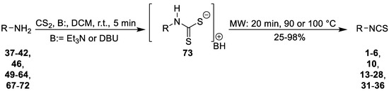 The isothiocyanates 1–6, 10, 13–28, and 31–36 were obtained by one-pot, two-step, microwave-assisted (MW) synthesis (Method A). Briefly, a mixture of aliphatic primary amines 37–42, 46, and 49–55 or aromatic amines 56–64 and 67–72, carbon disulfide (CS2) and triethylamine (Et3N) (for amines 37–42, 46, and 49–55), or DBU (for amines 56–64 and 67–72) were transformed under normal conditions at room temperature into the intermediate dithiocarbamates 73. Next, dithiocarbamates 73 were converted without any desulfurating reagent under microwave-assisted reaction (MW: 20 min, 90 °C for 37–42, 46, and 49–55 or 100 °C for 56–64 and 67–72) to ITCs 1–6, 10, 13–28, and 31–36 in good yields (25–98%) (Scheme 1, Table 1) [96].