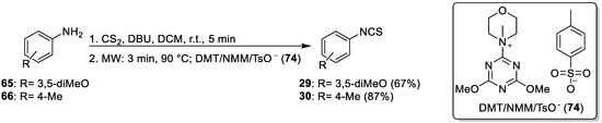 Isothiocyanates 29–30 were also synthesized by one-pot, two-step microwave-assisted synthesis using CS2, DBU, and aromatic amines 65 and 66 as substrates; however, a different MW method was used (Method B). The intermediate dithiocarbamates were synthesized, as shown in Method A. The second step however, performed under microwave-assisted conditions, was accomplished in a shorter time (MW: 3 min and 90 °C) and in the presence of 4-(4,6-dimethoxy-1,3,5-triazin-2-yl)-4-methylmorpholinium toluene-4-sulfonate (DMT/NMM/TsO−, 74) as a desulfurating reagent. Isothiocyanates 29 and 30 were isolated at high yields (67–87%) (Scheme 2) (Table 1) [97].