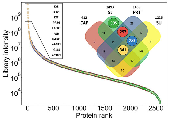 Figure 1. The library covers proteins with a range of more than six orders of magnitude in summed signal intensity. Number of proteins shown on the Venn diagram refers to number of protein groups, which may consist of more than one protein, and cannot be differentiated based on identified peptides. The lowest number of proteins could be identified in the pooled CAP sample (422 protein), while in the two indirect pooled tear samples (PRT and SU), a similar number of proteins could be detected (1439 and 1225) with a much higher overlap (1092 shared protein identifications). The SL samples were only included in the investigation to detect possible contaminants originating from the strong direct contact of the Schirmer’s strip with the ocular surface. This assumption is supported by the presence of nearly 1000 proteins, which were identified only in this type of pooled sample. These proteins are present in low abundance, according to their summed intensity (green dots in