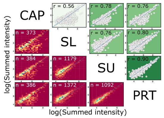 6], we could identify 432 in total, 426, 406, 392, and 192 in SL, PRT, SU, and CAP samples, respectively. These results highlight the comparable proteomics usability of PRT not just with SU samples processed and analyzed in our laboratory, but with numerous other methods.