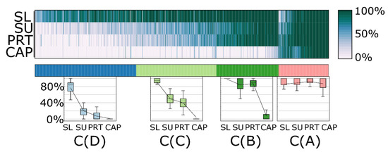 In Cluster A (pink), there were 195 proteins that could be measured with high frequency in all sample types (86–92% of the samples within any sample type). Cluster B (dark green) includes 242 proteins that were repeatedly measurable (84–98%) in samples from indirect procedures (SL, SU, and PRT), but they were quantifiable in only a few CAP samples (8%). The other two clusters consist of proteins that could be measured with high frequency in the SL samples, but in the SU and PRT samples only with medium (Cluster C), 312 proteins) or low (Cluster D), 395 proteins) frequency. Using this approach, proteins within the latest cluster may be marked as possible contaminants of tear samples. They have been found mainly in the SL samples, but rarely in any other sample group. On the other hand, proteins of Cluster A and B may be considered as common tear proteins, with the remark that CAP sampling provides reproducible detection for members of only Cluster A. It must be noted that PRT sampling produces the highest detection rate for proteins of those two clusters (see distributions on boxplots in