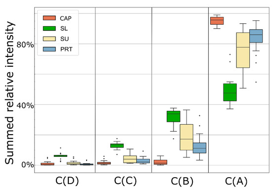 Figure 4). As expected, the highest level of the possible contaminating eye-surface proteins (395 and 317 proteins in Clusters D and C, respectively) were found in the SL samples, where on average 6.0% of the total intensity of all proteins is given by the proteins of Cluster D. CAP, SU, and PRT samples contain an average of 1.2, 1.5, and 0.7% proteins of that cluster. Proteins of Cluster C can be found at higher abundance in each sample type. Their values are still less than 5%, except for the SL samples (13% of total intensity). Proteins of Cluster B were detected only in a few CAP samples, and their intensity was low (on average 2%), while their relative abundance was highest in SL samples again (32% average). Members of Cluster A contribute the most to CAP sample protein intensity (95%), and slightly less than 50% in SL samples. The average abundance of these proteins is higher in PRT (83%) than in SU (76%) samples. For all clusters, the variance of PRT samples is lower than those in SU, but slightly higher than in CAP samples, which, however, have a less complex protein composition.