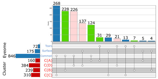 Figure 5), we can make further refinements of protein classification. The majority of the members of Cluster A are common (124), or specific to tears (31), thus we suggest classifying these as common tear fluid proteins. It must be noted that all Igs can be considered as such also, as those are found in Cluster A but excluded from the EyeOME. Most of the proteins of Cluster B (228 of 239) are common to tears and eye surface in EyeOME, rarely detected in CAP samples, therefore we can consider them as proteins of the lower layer of tear fluid and proteins easily and reproducibly collected from the eye surface using the indirect sampling methods. Altogether, these 437 proteins in Cluster A and B (392 in EyeOME) proteins we would classify as regular tear sample proteins, independent of origin (green in