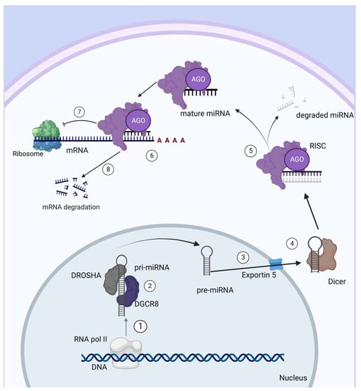 - Kim, Y.K.; Kim, B.; Kim, V.N. Re-evaluation of the roles of DROSHA, Export in 5, and DICER in microRNA biogenesis. Proc. Natl. Acad. Sci. USA 2016, 113, E1881–E1889. [Google Scholar] [CrossRef]