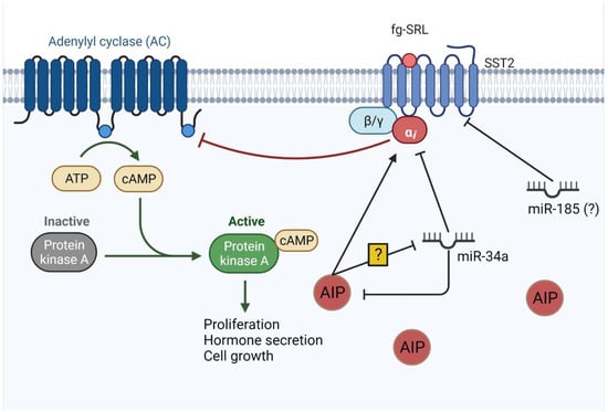 - Bogner, E.M.; Daly, A.F.; Gulde, S.; Karhu, A.; Irmler, M.; Beckers, J.; Mohr, H.; Beckers, A.; Pellegata, N.S. miR-34a is upregulated in AIP-mutated somatotropinomas and promotes octreotide resistance. Int. J. Cancer 2020, 147, 3523–3538. [Google Scholar] [CrossRef]