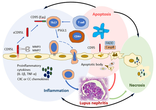 CD95 stimulation and potential links to inflammation activation. Three molecular complexes can occur with CD95 involvement to induce chronic inflammation (blue circle), apoptosis (pink circle), or necrosis (green circle). Apoptotic and necroptotic complexes control each other and the inflammatory complex (black lines). CD95 (FAS) promotes DC maturation and differentiation of Th17 and induction of the secretion of pro-inflammatory cytokines (IL-1β, TNF-α) and CXC or CC chemokines. The CD95-mediated apoptotic and non-apoptotic signaling pathways share many factors, such as the apoptotic factors FADD and caspase-8. Interaction of CD95 L with CD95 favors the recruitment of FADD to the death domain of CD95. Abbreviations: Th, T helper; DCs, dendritic cells; IL, Interleukin; TNF, Tumoral necrosis factor; CD95L, CD95 Ligand; MMP, Matrix metalloproteinase; PSGL-1, P-selectin glycoprotein ligand-1; FADD, Fas-associated death domain; Casp8, Caspase-8.