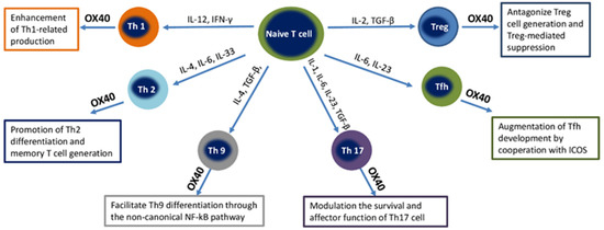 OX40–OX40L signals can enhance the Th1-mediated immune response, promote generation of Th2, favor Th9 differentiation through the non-canonical NF-κB pathway, augment Tfh development, and antagonize Treg generation and Treg-mediated suppression.