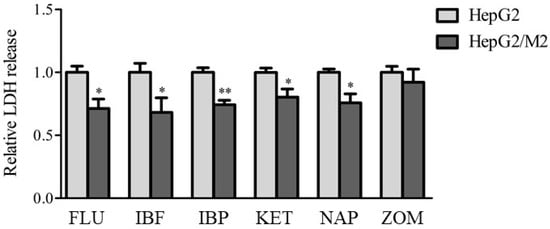 Relative LDH release to HepG2 alone in indirect co-culture HepG2/M2 (1:0.4) 24 h after treatments of FLU (500 μM), IBF (1 mM), IBP (1 mM), KET (1 mM), NAP (1 mM), or ZOM (1 mM). The results are expressed as the mean ± SE of each group (n = 4–5). Significant differences (* p < 0.05 and ** p < 0.01 vs. HepG2) were observed.
