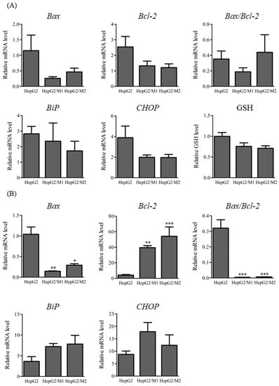 Relative mRNA levels of Bax, Bcl-2, and the ratios of Bax to Bcl-2 (A), and Bip, and CHOP, and relative GSH levels (B) in HepG2, HepG2/M1, and HepG2/M2 3 h and 24 h after DIC treatment (500 μM). The results are expressed as the mean ± SE of each group (n = 4–5). Significant differences (* p < 0.05, ** p < 0.01, and *** p < 0.001 vs. HepG2) were observed.