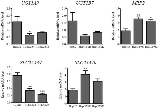 Relative mRNA levels of UGT1A9, UGT2B7, MRP2, SLC25A39, and SLC25A40 in HepG2 24 h after DIC treatment (500 μM) to HepG2, HepG2/M1, and HepG2/M2. The results are expressed as the mean ± SE of each group (n = 4–5). Significant differences (* p < 0.05, ** p < 0.01, and *** p < 0.001 vs. HepG2) were observed.