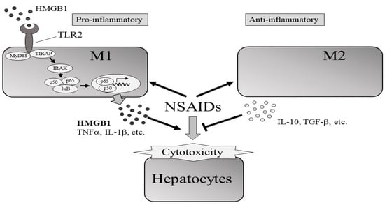 Drug-induced liver injury (DILI) is a frequent cause of liver injury after treatment with agents such as non-steroidal anti-inflammatory drugs (NSAIDs). Reactive metabolites of NSAIDs (e.g., NSAIDs acyl glucuronide (NSAIDs-AG) and benzoquinone imine) and/or macrophages are involved in DILI [,,,]. NSAIDs-AG is formed from NSAIDs catalyzed by UDP-glucuronosyltransferases (UGTs) such as UGT1A9 and UGT2B7 and is excreted into the bile via multidrug resistance-associated protein 2 (MRP2). Our group previously showed the involvement of NSAIDs-AG in inducing DILI [] and established an in vitro system to evaluate DILI using isolated murine hepatocytes co-cultured with peritoneal macrophages []. Another group demonstrated that a test using monocyte-derived hepatocyte-like cells was useful to identify DILI-associated drugs []. Macrophages are generally classified into M1 (a classical macrophage activation) and M2 (alternative macrophage activation). It is unclear whether M1 and/or M2 participate in NSAID-associated DILI. Elucidating the role of M1 and M2 in DILI induction is important to understand the detailed mechanism of NSAID-associated DILI and to develop preventive strategies for severe DILI. Danan and Teschke demonstrated that the main cause of DILI induction was treatment of NSAIDs in the Hawaii Department of Health with the application of RUCAM in a heterogeneous group of patients after use of multiple dietary supplements and synthetic drugs. Therefore, it is important to clarify the regulation of NSAIDs-induced DILI [].