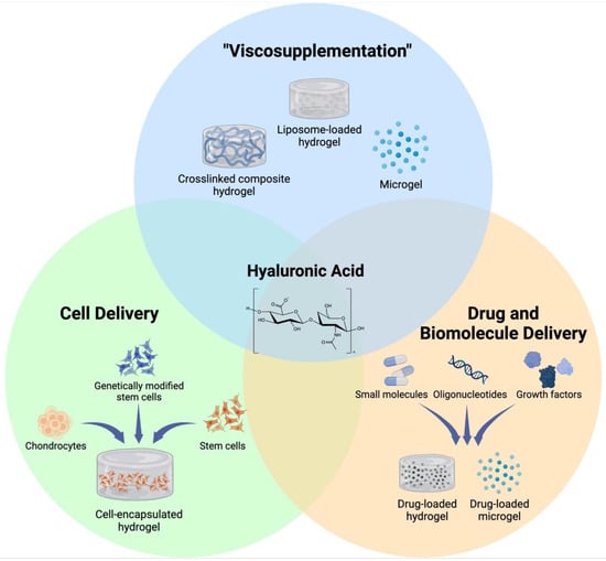 Different applications of HA-based hydrogels. Ease of chemical modification and excellent biocompatibility of HA allows for development of various HA-based hydrogels that are designed to serve distinct purposes for treatment of OA. Created with BioRender.com (accessed on 5 June 2022).