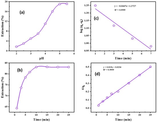 (a) Impacts of pH (0.1 M Na2SO4, 0.02 M Adogen 464, 5 min, O:A 1:1, 25 °C); (b) equilibration time on Cd2+ extraction (0.1 M Na2SO4, pH 5.0, 0.02 M Adogen 464, O:A 1:1, 25 °C); (c) The pseudo-1st-order; (d) pseudo-2nd-order modeling of Cd2+ extraction by Adogen 464.