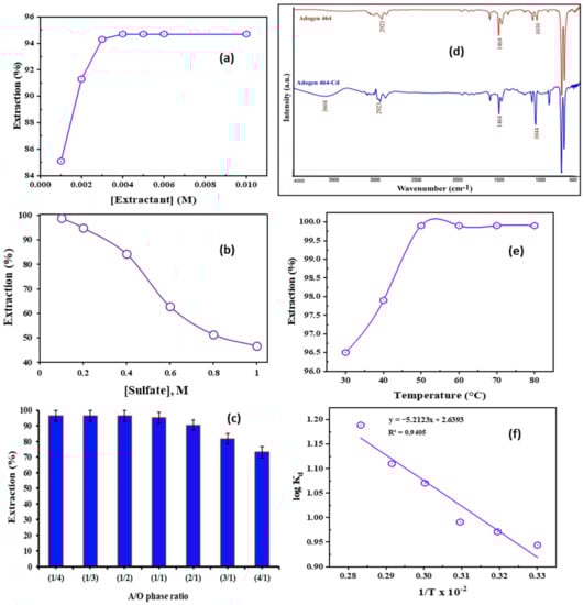 (a) Impact of Adogen 464 concentration upon Cd2+ extraction (0.1 M Na2SO4, pH 5.0, O:A 1:1, 25 °C, 10 min); (b) Impact of sulfate concentration upon Cd2+ extraction (0.2 M Adogen 464, pH 5.0, O:A 1:1, 10 min, 25 °C); (c) Impact of aqueous to organic ratio upon Cd2+ extraction (0.2 M Adogen 464, pH 5.0, 0.1 M Na2SO4, 10 min, 25 °C); (d) FTIR spectra of 0.2 M Adogen 464/toluene and cadmium/Adogen 464/toluene); (e) Impact of temp. upon Cd2+ extraction (0.2 M Adogen 464, pH 5.0, 0.1 M Na2SO4, O:A 1:1, 10 min); (f) Influence of temp. on Cd2+ partition coefficient (0.2 M Adogen 464, pH 5.0, 0.1 M Na2SO4, O:A 1:1, 10 min).