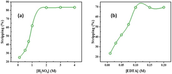 Influence of (a) H2SO4; (b) EDTA concentration upon Cd2+ stripping from the loaded Adogen 464.