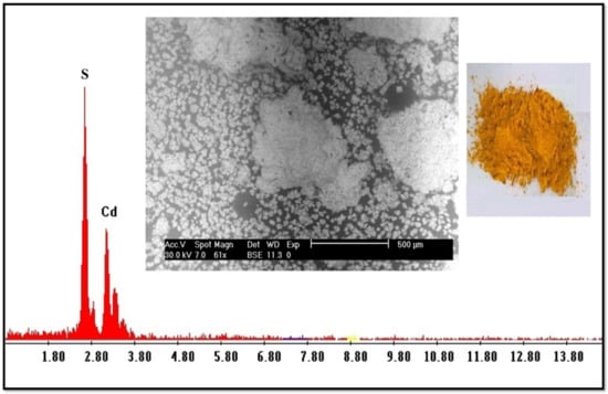 The sulfate solution containing Cd2+ produced from the stripping process was subjected to precipitation using 0.5% Na2S solution. Adjusting the pH to 1.25 at room temperature, a yellow precipitate of CdS was formed; it was separated via filtration and dried in the oven at 70 °C. The obtained product was about 2.0 g. The product has also been subjected to SEM-EDX analysis, as shown in Figure 4, which reveals a maximum purity.