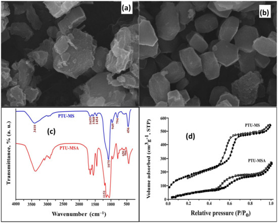 The morphology of PTU-MS was gained via an electron scanning microscope (SEM-EDX). The matrix mainly consisted of a hexagonal formation and showed a rather homogeneous particle size of about 0.85 mm PTU-MSA adsorbent (mean size) [48]. It was different from PTU-MS (Figure 5a,b). Moreover, the PTU-MS was analyzed using FTIR. The data showed major typical peaks in the range of 2900–3000 cm−1 due to aliphatic stretching of C–H. The feature at 1655 cm−1 is C=O for urea, that at 3410 cm−1 is due to phenolic –OH, and peaks at 1454 cm−1 and 1568 cm−1 correspond to N–H and N–C, respectively. Three bands are attributed to silica at 1075, 794, and 456 cm−1 of Si–O–Si. Moreover, a peak at 949 cm−1 is assigned to Si–OH [49,50,51,52,53,54].