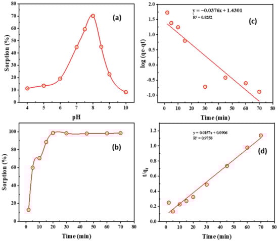 (a) impact of pH upon Co2+ adsorption (20 mL of 250 mg/L Co2+, 10 min, 0.1 g of PTU-MSA, 25 °C); (b) Impact of contacting time upon Co2+ adsorption (20 mL of 250 mg/L Co2+, pH 8.0, 0.08 g of PTU-MSA, 25 °C); (c) 1st-order kinetic plot; (d) 2nd-order kinetic plot of PTU-MSA’s Co2+ adsorption (20 mL of 250 mg/L Co2+, pH 8.0, 0.08 g of PTU-MSA, 25 °C).