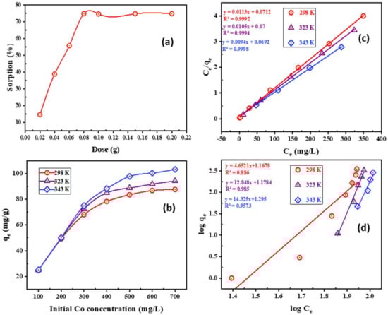 where Ce (mg·L−1) is the equilibrium concentration, qe (mg·g−1) is the equilibrating uptake of adsorbed Co2+, qmax (mg·g−1) is maximal sorption capability, and b (L·mg−1) is equilibrating adsorbance constant. Freundlich modeling is presumed such that adsorption performance is carried out with variable binding energies in scenarios with a heterogeneous surface (Figure 7d) [68,69,70,71,72,73]. The Freundlich modeling is expressed as Equation (7):