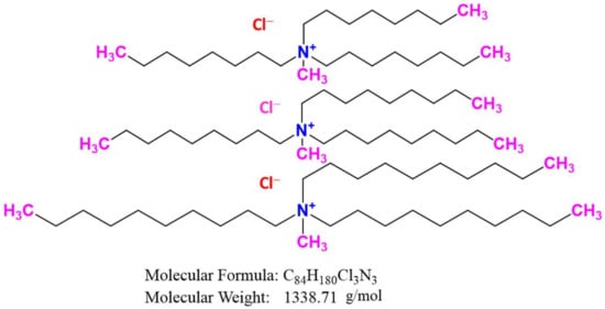 Solvent extraction is a very adaptable technique for the sometimes difficult extraction, purification, recovery, and separation of the aqueous medium incorporating metal ions [22]. It is a quick and straightforward, economical method [23]. Liquid-liquid extraction is employed for metal separation using immiscible fluids (usually one organic and another, an aqueous phase containing metal cations) in contact with each other. Most investigations employed the distribution ratios and metal separation factors with specified extractants for a particular metal [24,25]. Ionic liquids are task-specific extractants. They have useful and adaptable physicochemical properties, such as heat stability, high polarity, negligible steam pressure, inactivity, and a wide range of miscellaneous effects on other organic solvents, which have been highlighted in various scientific publications [26,27]. Adogen® 464 has been widely investigated in the extraction of metal chloride complexes. It is suitable for cadmium separation from cobalt, copper, zinc, and manganese [28,29].