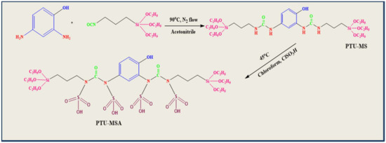 The spectrum of sulphonic acid-modified PTU-MSA shows new bands at 1151 cm−1 and a specific peak is recorded at around 584 cm−1, resulting from the SO3 group. The peak at 650 cm−1 is dispersed due to the stretching vibration of the S–N. The S–N band was predicted to overlap with the Si–O stretching band of the identical area of energy (Figure 5c). The spectrum of FT-IR confirmed that the surface of prepared PTU-MS and PTU-MSA material was successfully functionalized and synthesized [55,56].
