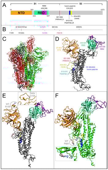 Domain organization and structural differences between the WT and Delta variant. (A) Graphical scheme of the spike domains from aa 14 to 1273: N-terminal domain (NTD) is represented in orange; the receptor-binding domain or RBD (aa 333–527) is highlighted in green; the receptor-binding motif, or RBM (aa 438–506), which is within RBD region, is represented in purple; the cleavage sequence at the S1/S2 boundary is colored in red; and the second cleavage site, the fusion peptide and the fusion peptide proximal region (FPPR) are represented in cyan, blue, and yellow, respectively. (B) Representation of Delta mutations, the numbering is aligned according to panel A. (C) Cartoon model visualization of the WT representative frame (629.8 ns of MD simulation) selected by cluster analyses. The monomers are colored in black, red (in up conformation), and green, respectively. (D) WT monomer 1 is represented with the same colors as the schematic domains in panel A. (E) Cartoon representation of WT monomer 1. The ellipse shows the conformation of the WT residue R158 and the rectangle shows the representative frame (655.4 ns) detail of the same region for the Delta variant with G158 mutation. (F) Cartoon representation of WT monomer 3. The ellipse and the rectangle show the conformations of the residue 681 for the WT and the Delta variant, respectively.