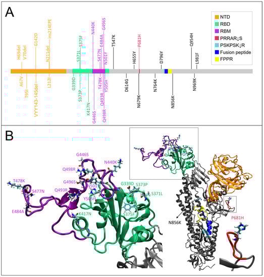 Since its first identification, multiple vaccines that are based on different technologies and several therapeutics against SARS-CoV-2 and its associated COVID-19 disease have been successfully developed in a concerted global effort to provide effective protection against severe illness [,,,]. However, new emerging variants have acquired mutations that hampered drug and vaccine efficacy, with a progressive increase in breakthrough infections have been reported [,,]. Therefore, obtaining a rapid and refined tri-dimensional structure analysis of the proteins that are mainly involved in the host-pathogen interaction can ensure that new variants with potential impact on public health are assessed in a timely manner. In particular, the study of protein dynamics that are involved in host-pathogen interaction processes can be useful to evaluate pathogenicity and transmission. Herein, we carry out an investigation into the S glycoprotein, starting with the comparison of the S glycoprotein of WT SARS-CoV-2 with those from beta-coronaviruses, that were previously isolated in bat and pangolin in China []; and followed by the comparison of WT SARS-CoV-2 and the Alpha variant []. In this work, we focus on the Omicron variant, which carries 50 mutations across the genome, including 30 in the S gene [] and is widely spread, causing major concerns about its infectivity and immunological escape. This is in comparison to the previous widespread Delta variant, which harbored only 29 mutations, seven of which were in the S gene [], as compared to the wild-type SARS-CoV-2.