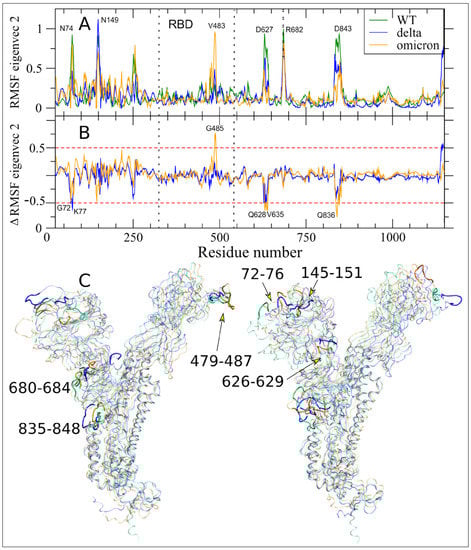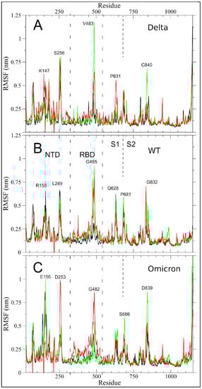 We first investigated the impact of the mutations that had accumulated in the Delta (Figure 1) and Omicron (Figure 2) variants as compared to WT on the per-residue root mean square fluctuations (RMSF) of S glycoprotein of SARS-CoV-2 in glycosylated form, that were obtained by one-microsecond molecular dynamics (MD) simulations (Figure 3), using an approach that was similar to the work that was done for the structural and dynamic characterization of the Alpha variant (see Borocci and coauthors []).
