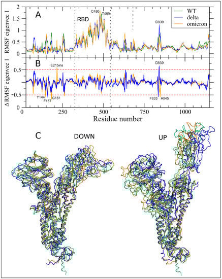 The filtered RMSF along V1 for the three simulations is shown in Figure 4A. The figure shows that the motions along V1 are dominated by the rotation of the RBD between the down and up conformations (peak of fluctuations in C480 of Omicron, P479 in Delta, and T489 in WT), and the correlated motion in the 834–853 aa, named as the fusion peptide proximal region (FPPR) by Cai and coauthors []. The correlated motion along V1, connecting RBD and the FPPR region, was already observed in the simulations of S glycoproteins of SARS-CoV-2 ancestors [] and of the Alpha variant [], suggesting its relevance in viral pathogenesis and a key role for FPPR has been proposed in the transition between RBD up and down conformations [].