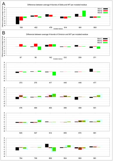 The hydrogen bond analyses that were performed (Figure 6) point out that, on average, the 30 residues with point mutations in Omicron introduce much smaller changes compared to the six in Delta, which leads us to speculate that more numerous Omicron mutations have a less relevant impact in terms of local H-bonds that are created or broken than Delta mutations.