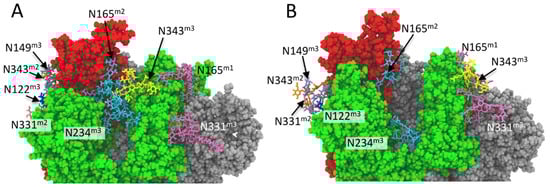As previously reported [], other glycans are involved in the modulation of the flexibility of RBD domain in up conformation. The glycansat N122 (M5) and N149 (FA2) of monomer 3 make a network of hydrogen bonds with the amino acids of RBD of monomer 2 and the glycanat N331 (FA2) and N343 (FA1) of monomer 2. This network of hydrogen bonds is located on the opposite side with respect to the hydrogen bonds network that is formed by the glycans at N165, N234, and N343 (Figure 7A).