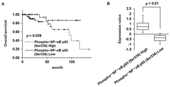 The prognostic value of phospho-NF-κB p65 (Ser536) protein and NFKBIA expression in TNBC was calculated using the Kaplan–Meier Plotter (http://kmplot.com/analysis/ (accessed on 9 June 2022)), a database that unifies clinical data and protein expression data [,]. The patient samples were split into two groups (high and low expression) and compared using a Kaplan–Meier survival plot. The log-rank p-value was then calculated.