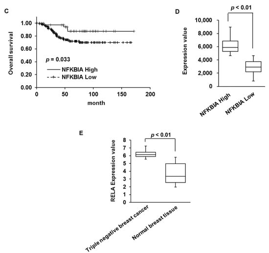 Recently, NF-κB p65 (RELA) gene expression was reported to be increased in TNBC compared to that in other subtypes, deeply involved in TNBC stem cell survival, and activated during the recurrence of breast cancers, including TNBC [,,]. NF-κB, a transcription factor that promotes cell proliferation, differentiation, and survival, is involved in tumorigenesis and cancer survival in various solid tumors, including pancreatic, lung, cervical, prostate, breast, and gastric cancers []. Therefore, NF-κB may be a new therapeutic target molecule for TNBC.