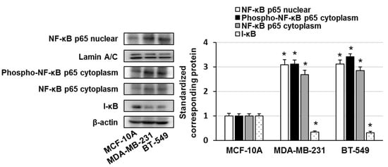 In this study, overexpression of phosphorylated NF-κB p65 and low expression of NFKBIA were correlated with poor prognosis in patients with TNBC. NF-κB p65 expression (nuclear and cytoplasmic) and I-κB expression were higher and lower, respectively, in MDA-MB-231 and BT-549 cells than in MCF-10A cells. The expression of RELA is higher in patients with TNBC than in patients with other breast cancer subtypes (luminal A, luminal B, and HER2-positive) and in normal breast tissue []. In addition, NFKBIA deletion is associated with poor disease-specific survival, recurrence-free survival, and distant metastasis survival in patients with TNBC []. Our findings indicated that the overexpression and activation of NF-κB p65 and the low expression of NFKBIA (I-κB) in TNBC were correlated with poor prognosis. Therefore, NF-κB p65 may be a therapeutic target molecule in TNBC.
