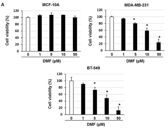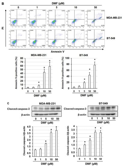 DMF induced apoptosis in MDA-MB-231 and BT-549 cells. (A) Viability of DMF-treated MCF-10A, MDA-MB-231, and BT-549 cells, as determined by the trypan blue staining assay. Cells were treated with the shown concentrations of DMF for 3 days. The results are representative of five independent experiments. * p < 0.01 vs. untreated cells. (B) MDA-MB-231 and BT-549 cells were treated with the shown concentrations of DMF for 72 h and then stained using an Annexin V apoptosis assay kit. The results are representative of four independent experiments. * p < 0.01 vs. untreated cells. (C) Cell lysates were evaluated by immunoblotting using the shown antibodies. The content of cleaved caspase-3 was quantified and standardized to the content of β-actin. The results are representative of three independent experiments. * p < 0.01 vs. untreated cells.