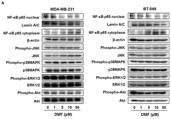 We previously clarified that DMF inhibits the nuclear translocation of NF-κB p65 in tumor cells [,]. In this study, we examined whether DMF inhibits the nuclear translocation of NF-κB and the expression of other survival signals, such as JNK, p38MAPK, ERK1/2, and AKT, in MDA-MB-231 and BT-549 cells. DMF inhibited and enhanced the expression of nuclear and cytoplasmic NF-κB p65, respectively, in MDA-MB-231 and BT-549 cells but did not affect the activation of JNK, p38MAPK, ERK1/2, or AKT (Figure 4A).