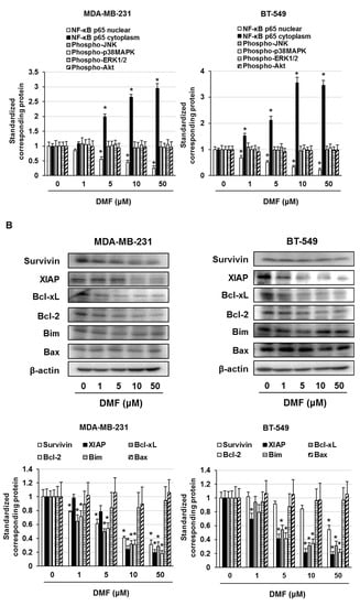 DMF suppressed NF-κB nuclear translocation and Survivin, XIAP, Bcl-xL, and Bcl-2 expression in MDA-MB-231 and BT-549 cells. (A) Cell lysates were evaluated by immunoblotting using the shown antibodies. The contents of nuclear NF-κB p65, cytoplasmic NF-κB p65, phospho-JNK, phospho-p38MAPK, phospho-ERK1/2, and phospho-Akt were quantified and standardized to the contents of Lamin A/C, β-actin, JNK, p38MAPK, ERK1/2, or AKT. The results are exemplary of three independent experiments. * p < 0.01 vs. untreated cells. (B) Cell lysates were evaluated by immunoblotting using the shown antibodies. The contents of Survivin, XIAP, Bcl-xL, Bcl-2, Bim, and Bax were quantified and standardized to the content of β-actin. The results are exemplary of three independent experiments. * p < 0.01 vs. untreated cells.