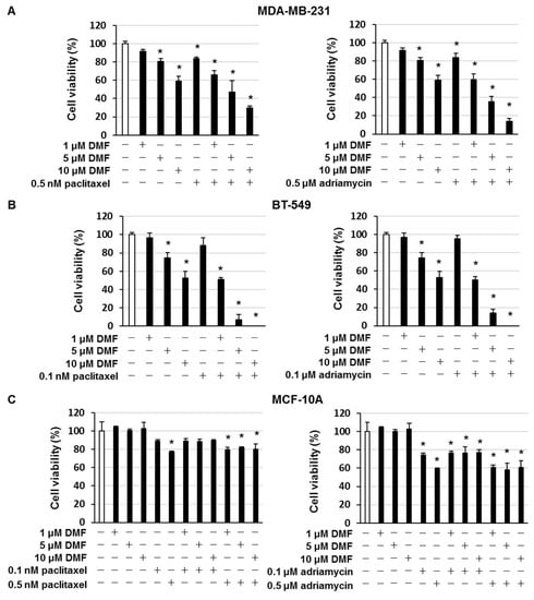 DMF enhanced the cytotoxic effect of paclitaxel and adriamycin in TNBC cells. (A) MDA-MB-231, (B) BT-549, and (C) MCF-10A cells were treated with the shown concentrations of DMF and paclitaxel or adriamycin. After incubation for 72 h, the number of dead cells was quantified using the trypan blue staining assay. The results are exemplary of five independent experiments. * p < 0.01 vs. untreated cells.