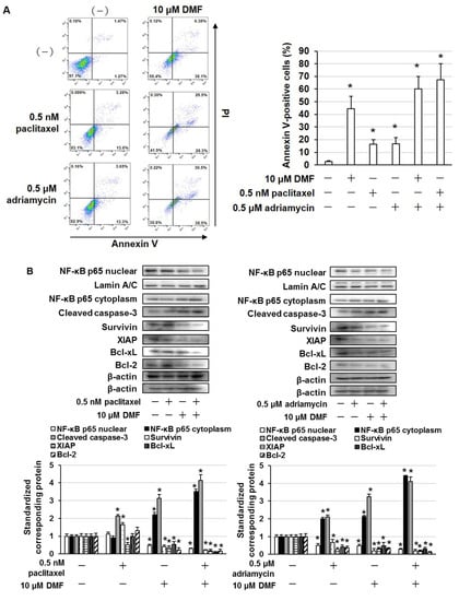 DMF enhanced the apoptosis-inducing effect of paclitaxel and adriamycin in MDA-MB-231 cells. (A) MDA-MB-231 cells were treated with the shown concentrations of DMF, paclitaxel, or adriamycin for 72 h and then stained using an Annexin V apoptosis assay kit. The results are exemplary of four independent experiments. * p < 0.01 vs. untreated cells. (B) DMF-, paclitaxel-, or adriamycin-treated cell lysates were evaluated by immunoblotting using the shown antibodies. The contents of nuclear NF-κB p65, cytoplasmic NF-κB p65, cleaved caspase-3, Survivin, XIAP, Bcl-xL, and Bcl-2 were quantified and standardized to the contents of Lamin A/C or β-actin. The results are exemplary of three independent experiments. * p < 0.01 vs. untreated cells.