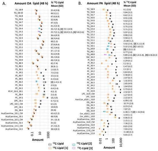 The proportion of phospholipids that contained a labeled 13C (amount of 13C lipid/amount of 13C lipid plus matching endogenous 12C lipid) was much lower (12% for 13C-OA phospholipids as a class, <3% for 13C-PA phospholipids as a class) than the proportion of 13C- TGs, DGs and acylcarnitines (30–50% for 13C-OA lipids, 7–26% for 13C-PA lipids). This suggests that the turnover and replacement of glycerolipids and acylcarnitines is much faster than phospholipids, consistent with previous findings [].