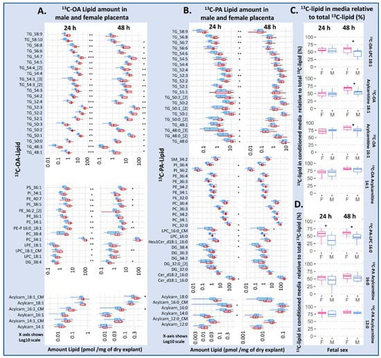 Differences in amount of lipid in placental explants from males (blue) and females (red) treated with 100 µM 13C-OA (A), or 100 µM 13C-PA (B) for 48 h. (C,D) The percentage of labeled lipid found in media relative to the total amount of the specific 13C lipid in the media and explant, in males and females. Boxes and whiskers represent median, interquartile range and minimum and maximum. X axis is log10 scaled. Statistically significant differences between sexes following Benjamini–Hochberg correction for multiple testing * p < 0.05, ** p < 0.01, *** p < 0.001. Abbreviations, Cer: ceramide, DG: diacylglycerol, Hex1Cer: hexosylceramide, LPC: lysophosphatidylcholine, LPE: lysophosphatidylethanolamine, OA: oleic acid, PA: palmitic acid, PC: phosphatidylcholine, PE-P: phosphatidylethanolamine-plasmalogen, TG: triacylglycerols. F: female, M: male.