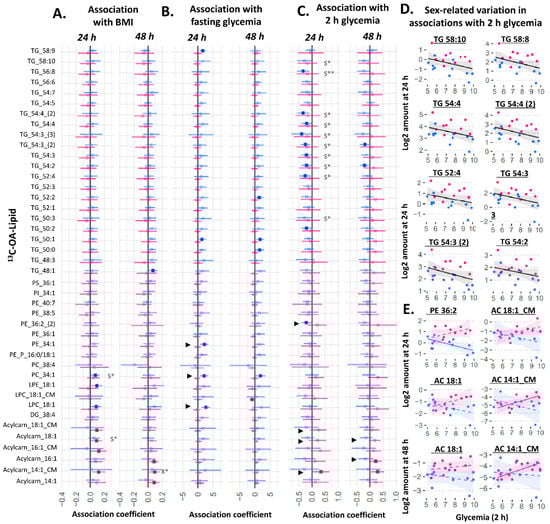 Sex-stratified associations between the amount of 13C-OA lipid (outcome) and maternal glycemia or maternal BMI (predictor). X* represents p < 0.05 in linear regression with males and females combined (not shown). S* represents p < 0.05, while S** represents p < 0.01 in linear regression adjusted for sex (not shown). ► represents significant p < 0.05 for the interaction between sex and maternal glycemia on lipid amount. Linear regression was then run separately for males and females. Forest plots (A–C) show association coefficient and 95% confidence intervals for males (blue) and females (red) with significance (p < 0.05) shown by dark-colored filled squares. Unadjusted scatter plots illustrating examples of the relationship between 2 h glycemia and amount of lipid for (D) lipids where males and females show similar relationships and for (E) lipids where males and females show different relationships. The Benjamini–Hochberg method was used to correct for multiple testing. Abbreviations: Acylcarn and AC: acylcarnitine, DG: diacylglycerol, LPC: lysophosphatidylcholine, LPE: lysophosphatidylethanolamine, OA: oleic acid, PA: palmitic acid, PC: phosphatidylcholine, PE-P: phosphatidylethanolamine-plasmalogen, TG: triacylglycerols.